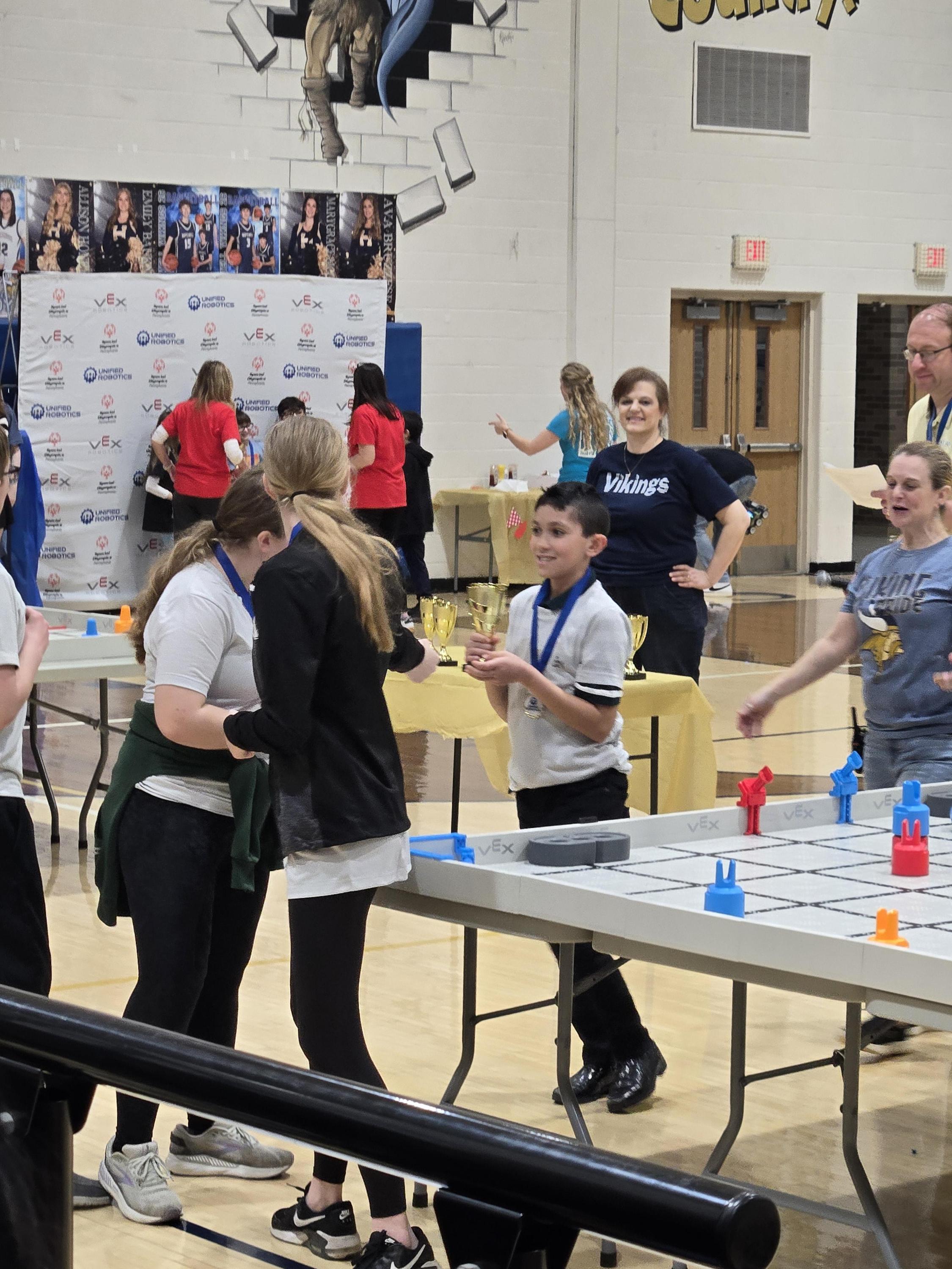 The Riverside MS Unified robotics team competed on Friday. They made it to the top 10 teams in the competition, and their final score was 85 (the top score was 118). They also won an award: the inclusion award! They were recognized for how everyone participated and how well they worked togther. We are so proud of our team!